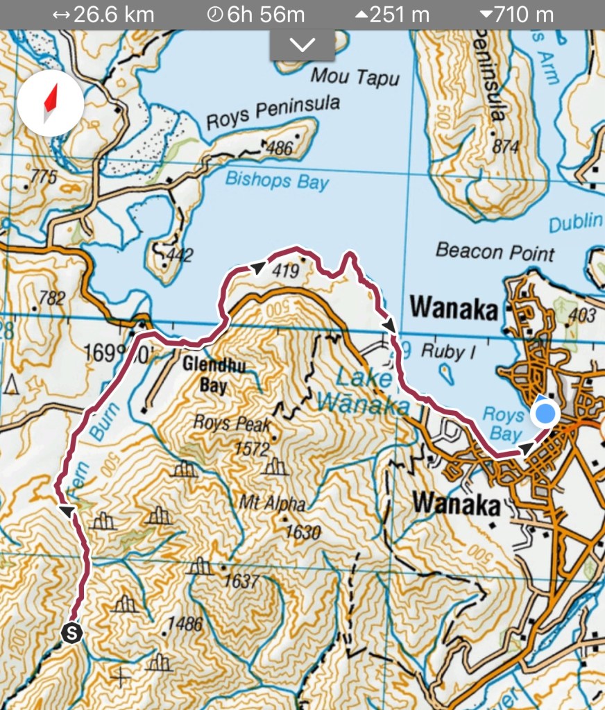 Over a bit of grassy farmland / conservation area to the Fern Burn Carpark and along a gravel road to Lake Wānaka – Glendhu Bay.