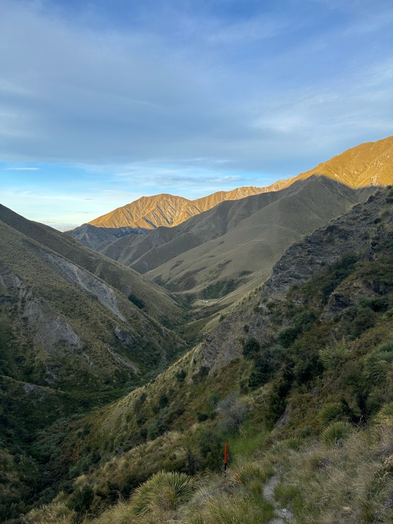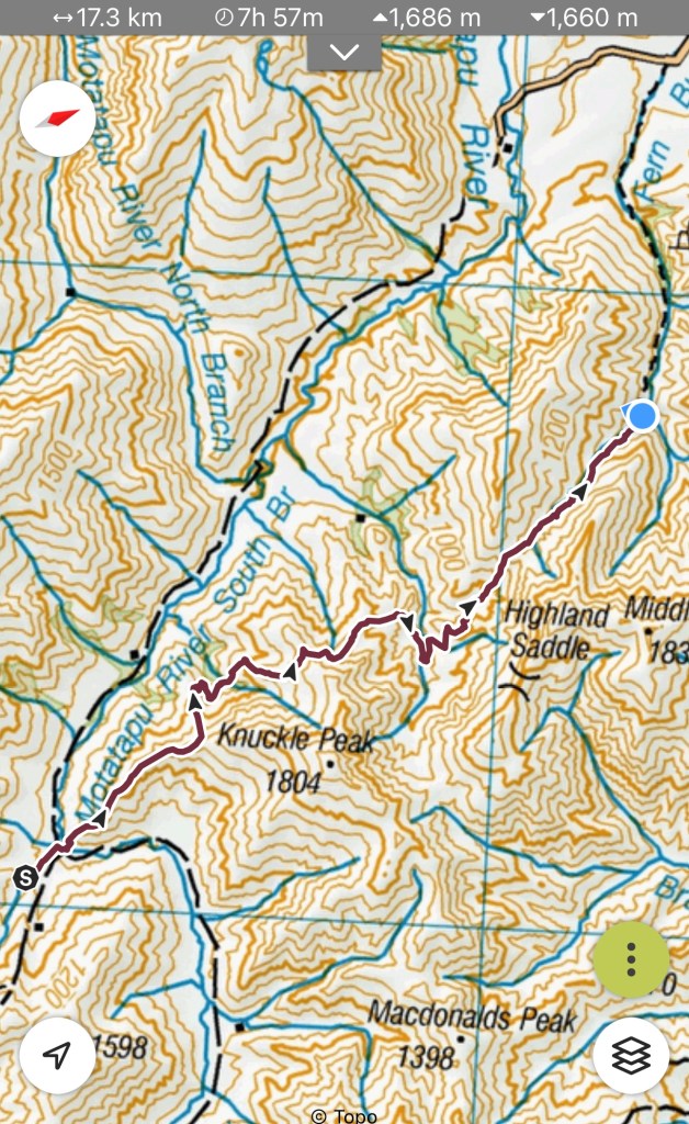 Walked from Roses Hut over two hills to get to Highland Creek Hut. Had a late lunch – early dinner – and walked the third hill to get to Fern Burn Hut.