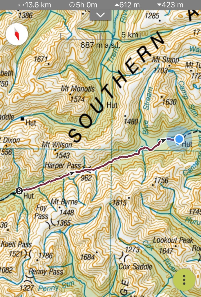It was a bit of a climb after the bridge through forest to Harpers Pass at 962m altitude. I reached the pass around 12.45pm and continued another hour to Harpers Bivy for a leisurely lunch.