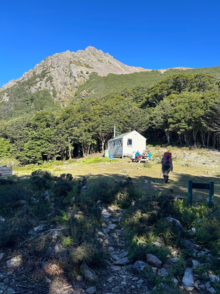 It was a lovely sunny evening and we joined other trampers for dinner on the picnic table.